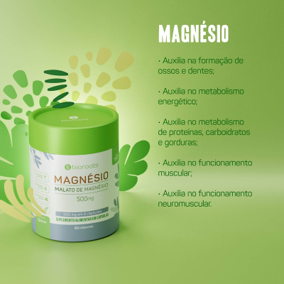 O Magnésio Malato Bioroots fornece 500 mg por porção. O Magnésio é um mineral importante e amplamente suplementado, visto que participa de mais de 300 reações bioquímicas fundamentais para o corpo humano. O magnésio Bioroots é malato, potencializando a absorção deste potente ingrediente, que pode melhorar a qualidade de vida, ajudando na saúde física, emocional e geral.