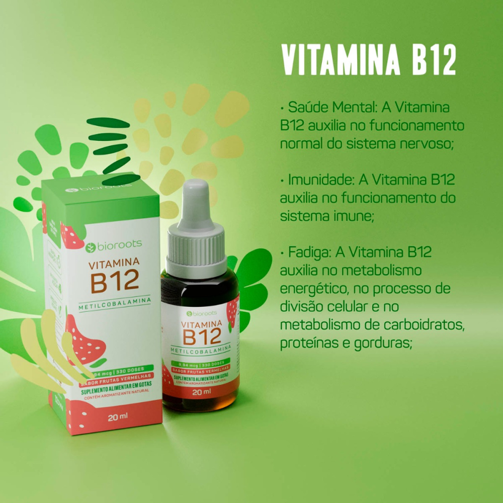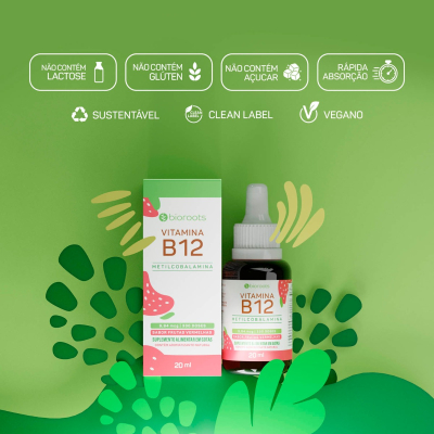 A Vitamina B12 da Bioroots é um suplemento alimentar em gotas de Vitamina B12 em forma de Metilcobalamina, a fonte mais indicada por profissionais de saúde.